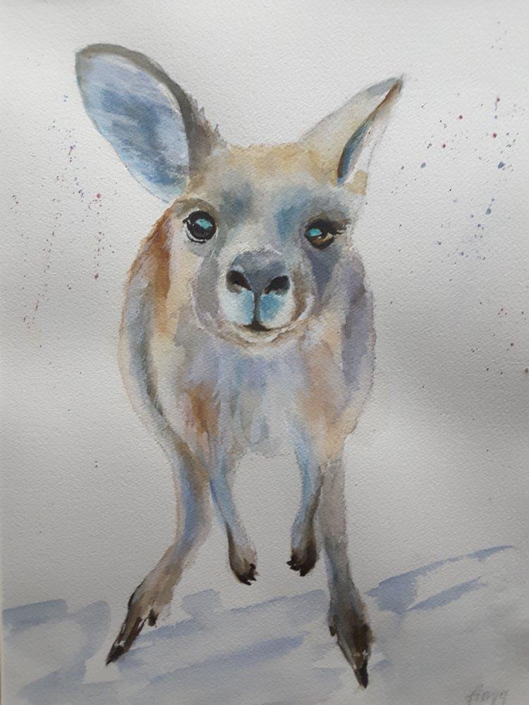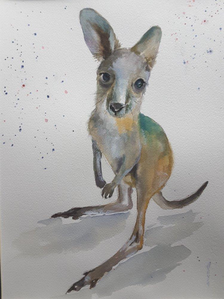 Painted in delicate watercolor layers, the soft transitions and splashes of colour bring out the joey’s innocence, curiosity, and playful charm.